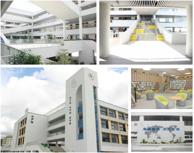 新校址分设教学、运动与生活三大功能板块,包括立学楼、成玉楼、励事楼和俊德楼等建筑。教室宽敞明亮,课桌椅均适配午休功能。