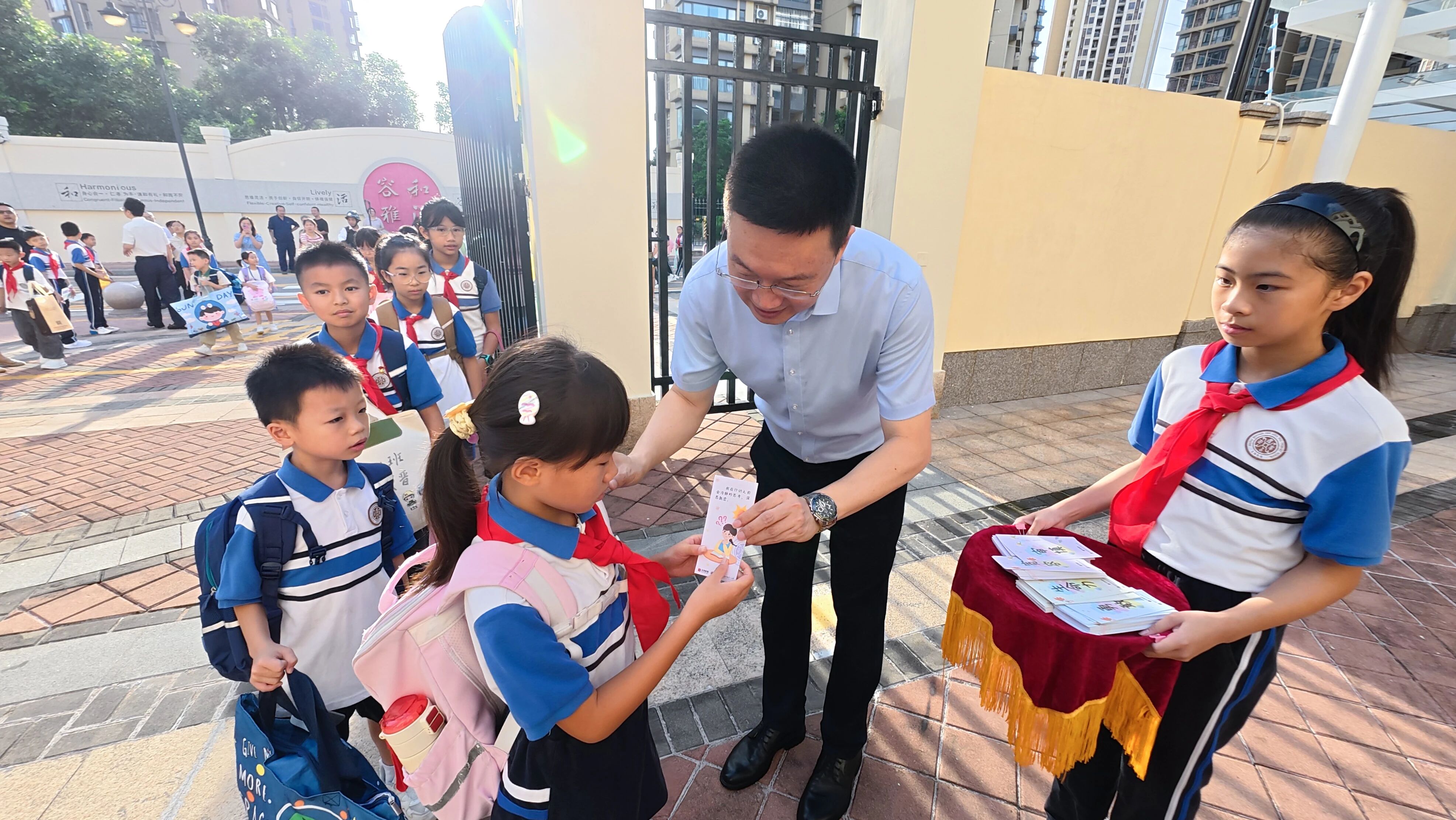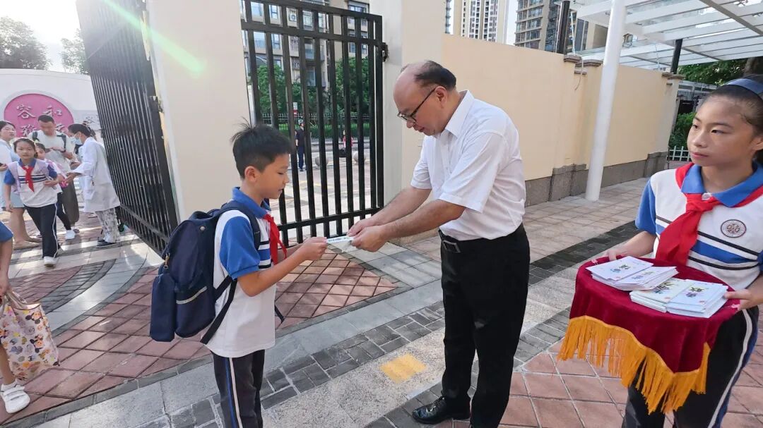 横琴一小用五彩气球装点校门,同学们通过击掌传递能量,签收“积极能量书签”。