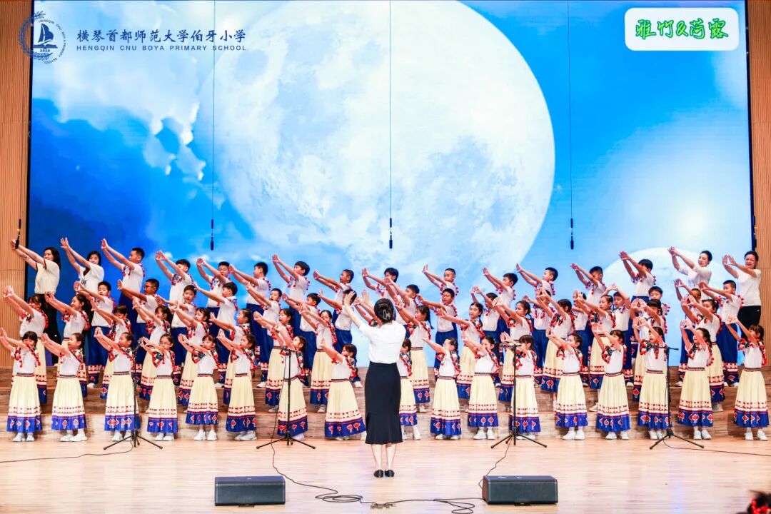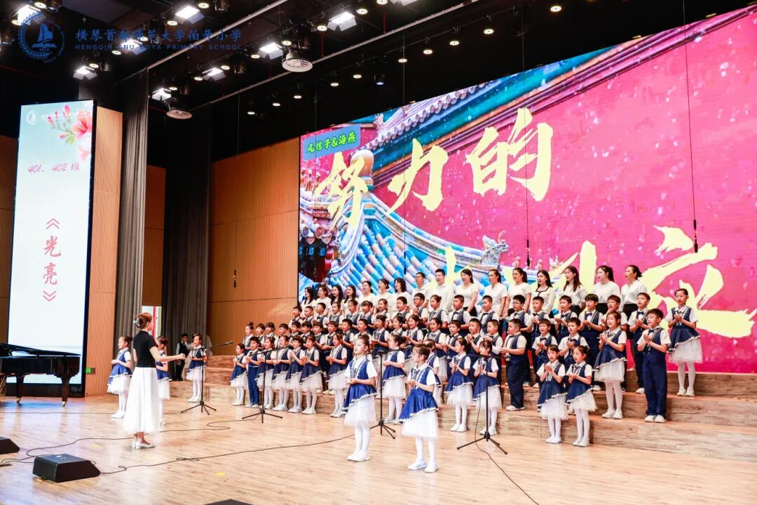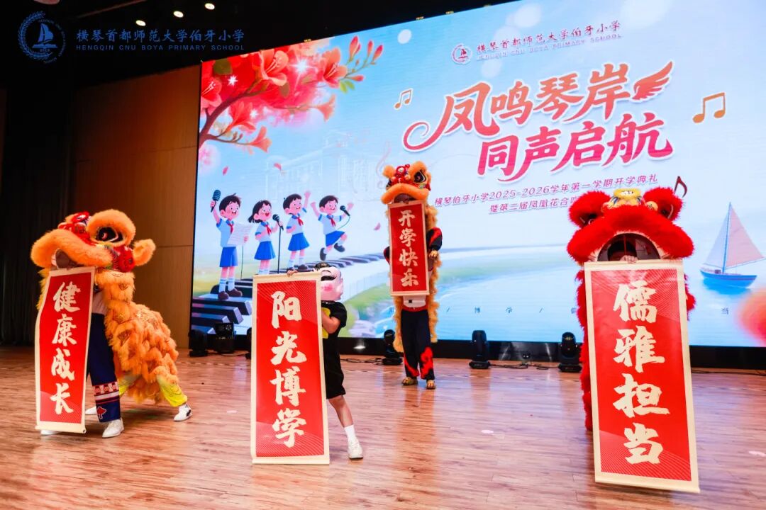 横琴伯牙小学举办“凤鸣琴岸 同声启航”开学典礼暨第二届凤凰花合唱节,各年级学生登台合唱,教师与家长共同献唱。