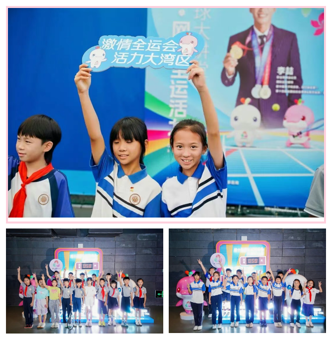 在工作人员引导下,同学们依次参观新闻发布厅、中心球场及外赛场,深入了解了横琴国际网球中心曾举办的重要网球赛事,感受十五运会比赛场馆的赛事氛围。十五运会主题装置空间成为焦点,吉祥物“喜洋洋”和“乐融融”备受喜爱,成为现场最受欢迎的“打卡点”。同学们在融合琴澳地标与全运元素的背景前合影,留下难忘瞬间。