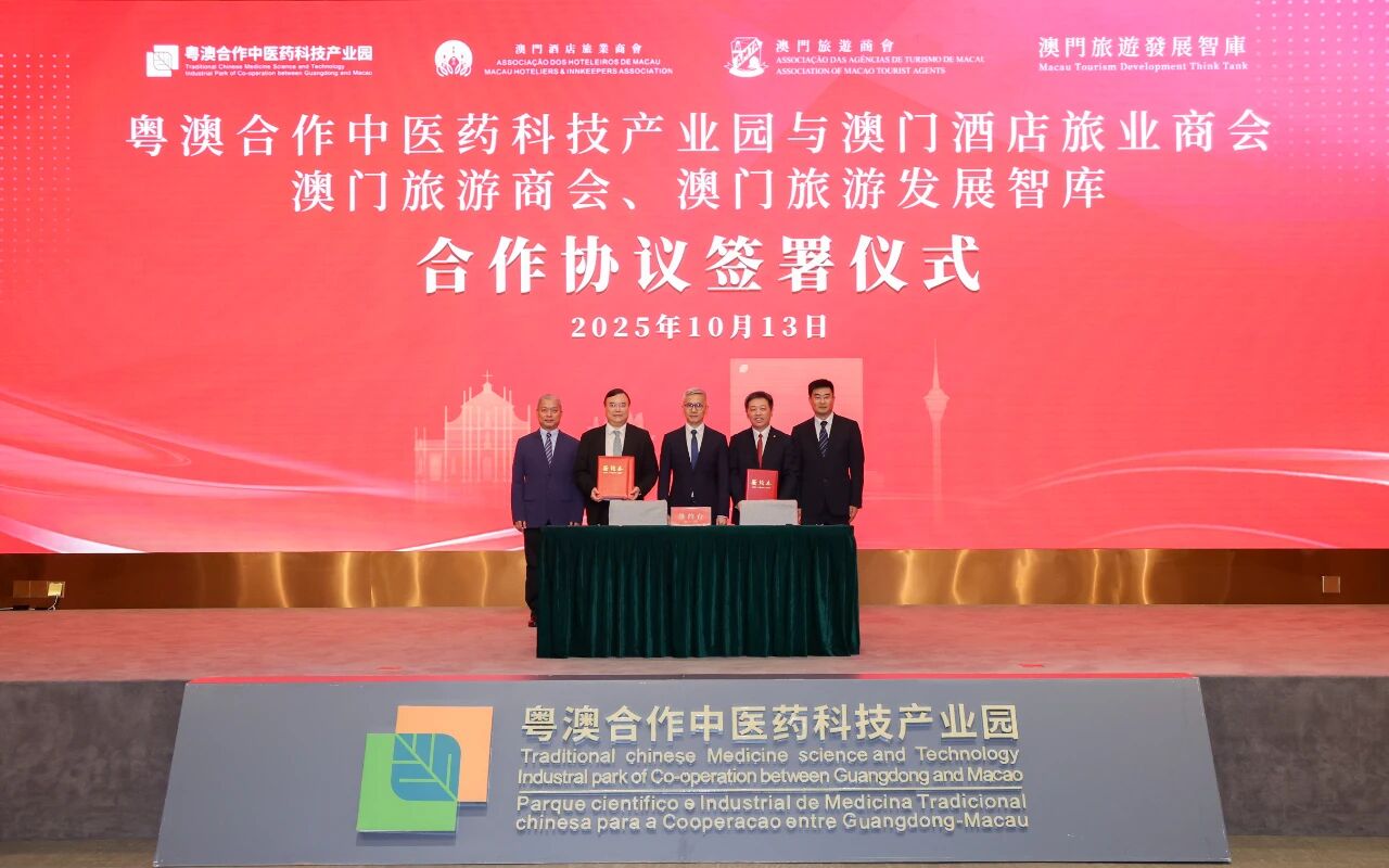 10月13日,粤澳合作中医药科技产业园与澳门酒店旅业商会、澳门旅游商会及澳门旅游发展智库签署合作协议,标志着各方在“中医药大健康+旅游”跨界融合发展道路上迈出坚实一步。