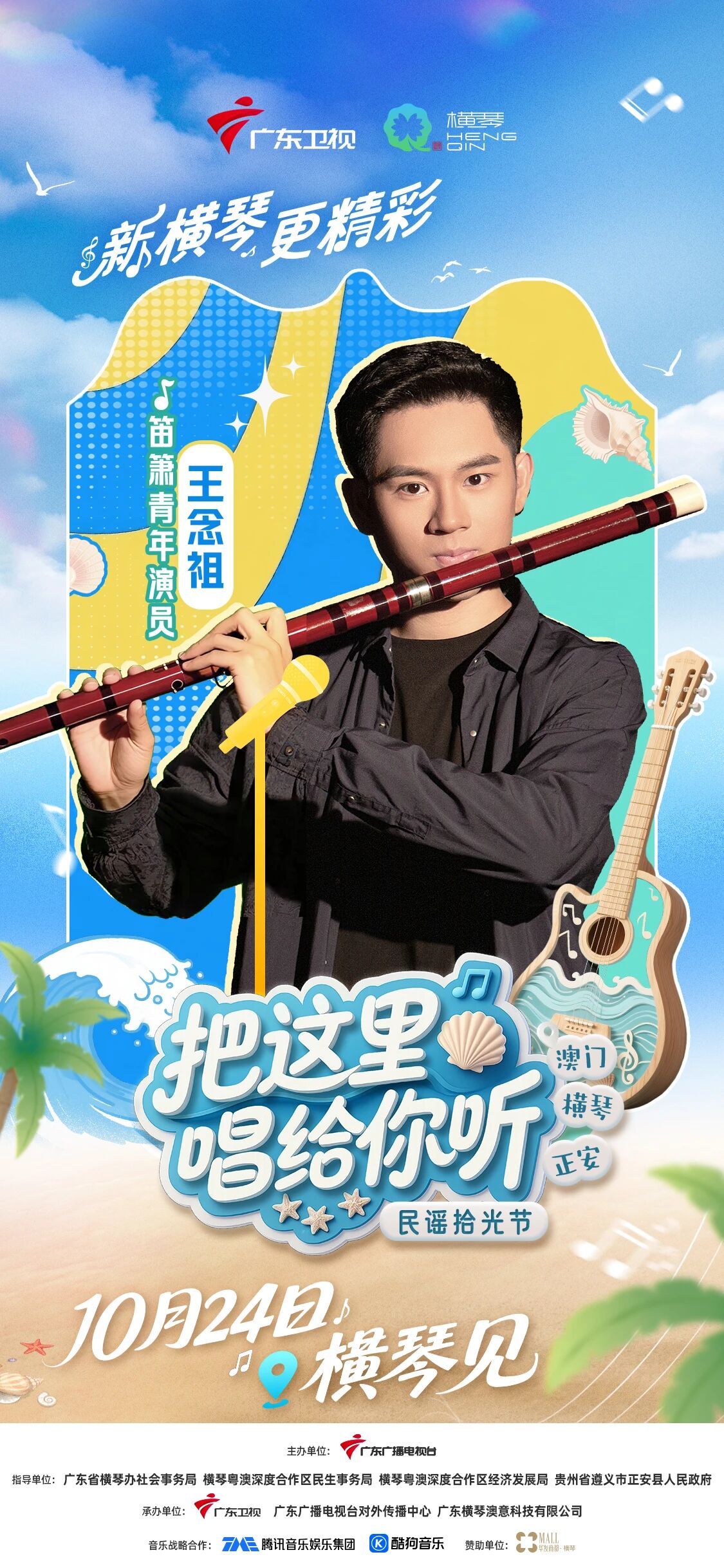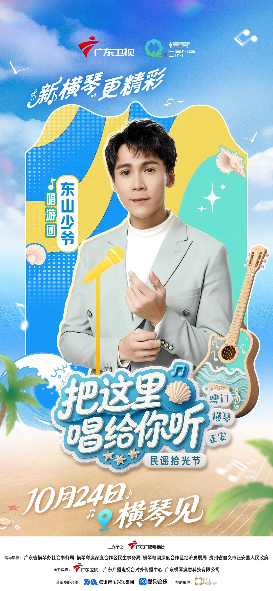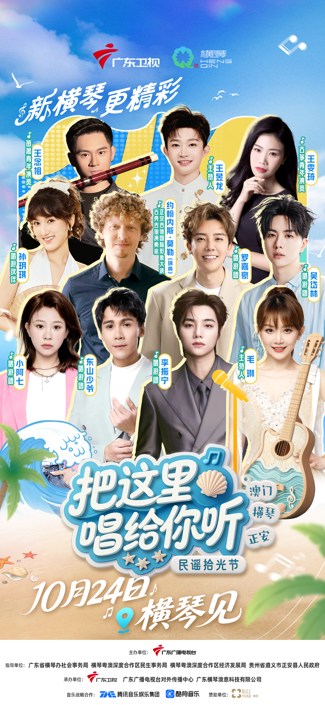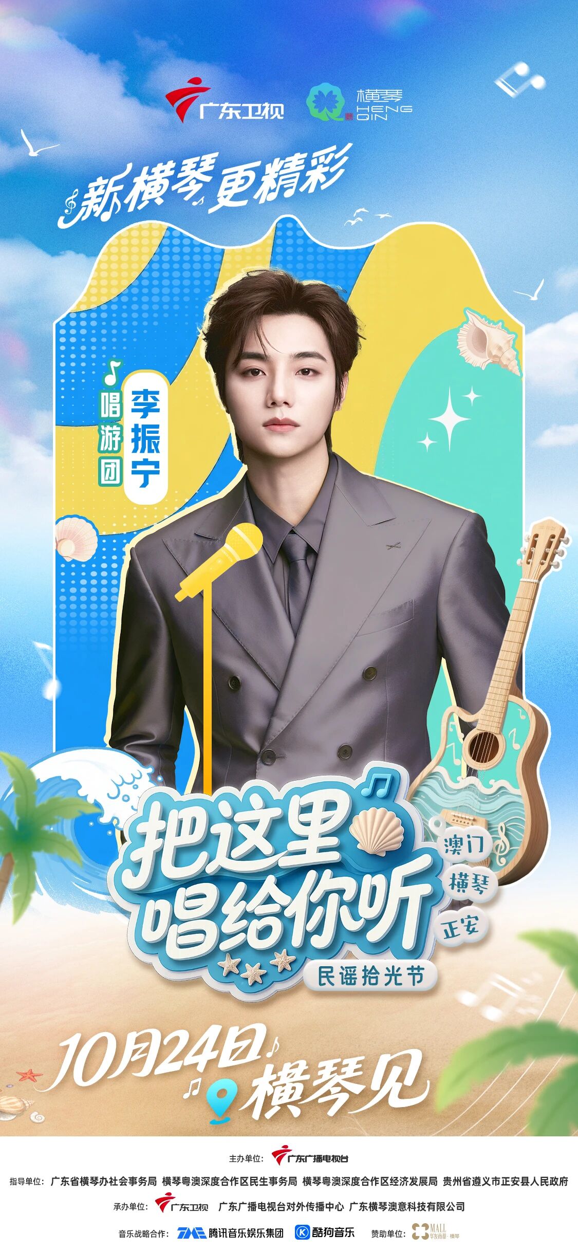 10月24日(周五),广东卫视《把这里唱给你听·民谣拾光节》将在横琴粤澳深度合作区开启收官录制,李振宁等国内外音乐人齐聚合作区,共谱山海民谣终章。