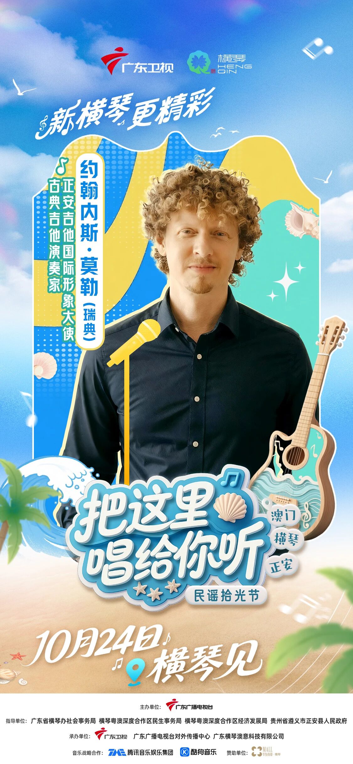 山海民谣迎温暖收官,广东卫视《把这里唱给你听·民谣拾光节》10月24日开启收官录制,湾区歌手、古典吉他大师、青春乐手等不同地域、不同风格的音乐人,携多元音乐风格加盟,李振宁、东山少爷、小阿七、罗嘉豪、吴岱林、约翰内斯·莫勒 (瑞典)相约横琴唱响终章,让这里的旋律永存心间!