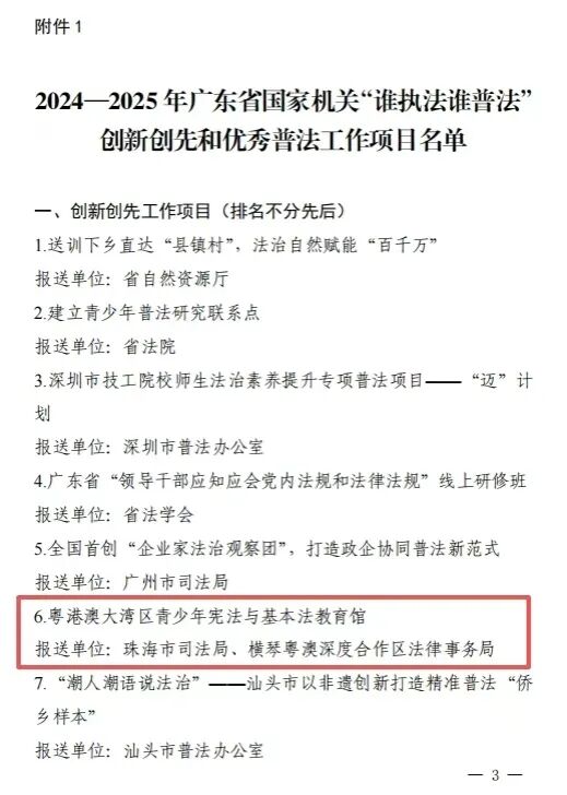 近日,广东省普法办公室公布2024-2025年全省国家机关“谁执法谁普法”创新创先和优秀普法工作项目名单。横琴粤澳深度合作区主导建设的“粤港澳大湾区青少年宪法与基本法教育馆”入选全省10个创新创先工作项目之一。