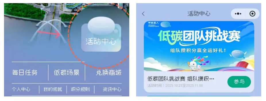 打开“琴碳星人”小程序,进入【活动中心】-【低碳挑战赛·团队赛】板块报名,创建队伍或者加入已有的队伍,跟着洛卡开启不一样的低碳积分赛吧。