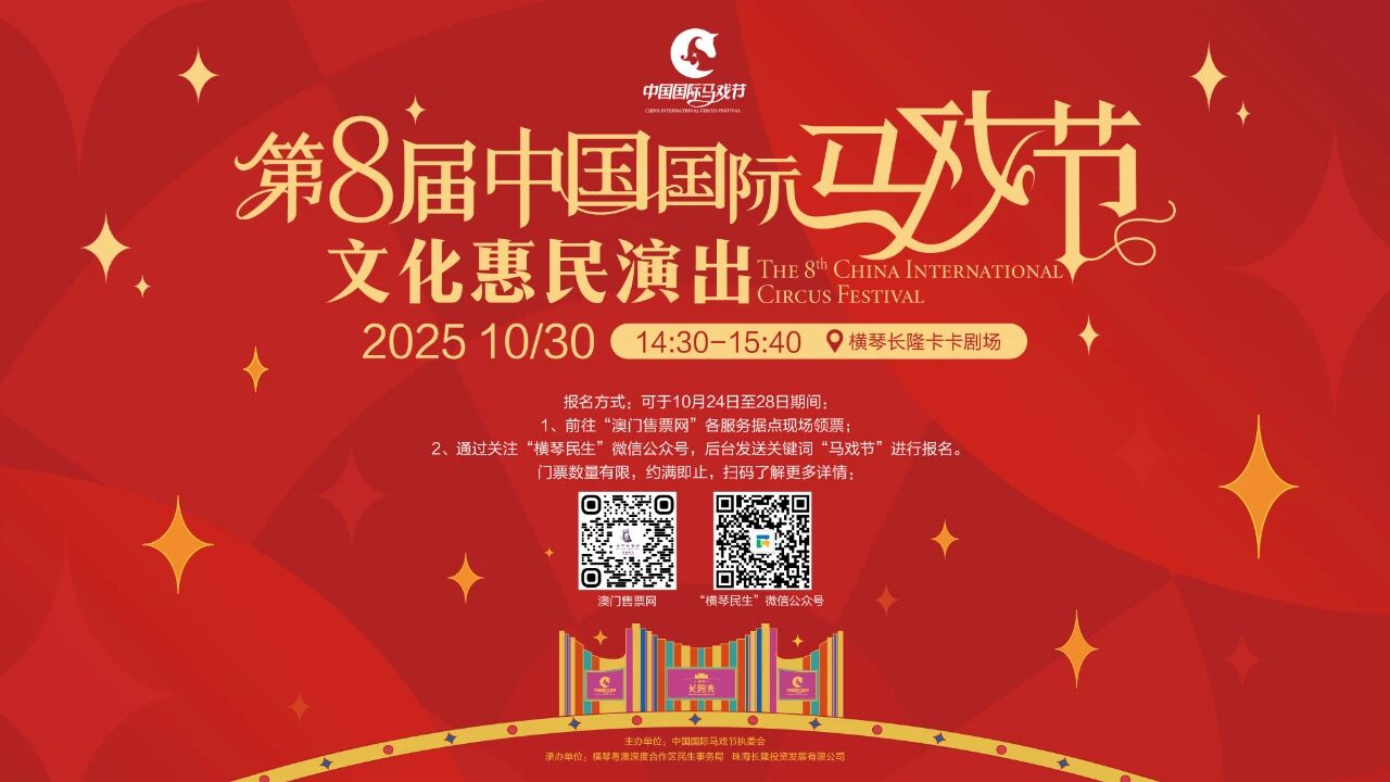 第八届马戏节惠民演出琴澳居民专场10月30日14:30的门票即日起面向横琴及澳门居民免费发放。数量有限,领完即止!