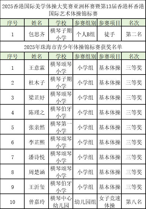 10月30日至11月2日,横琴青少年体操队进行双线作战,同步征战2025年珠海市青少年体操锦标赛与2025香港国际美学体操大奖赛亚洲杯赛暨第13届香港杯香港国际艺术体操锦标赛,最终斩获1银、1个前八名和1个三等奖的优异成绩,成功实现队伍从零基础组队到参赛获奖的跨越式突破。