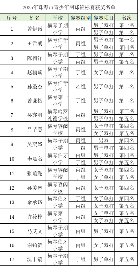 11月2日,为期两天的2025年珠海市青少年网球锦标赛在激烈角逐中圆满落幕。横琴青少年网球队的小将们代表各自学校出征,最终斩获3金3银1铜及14个前八名的优异成绩,延续队伍在市级赛事中的强势表现。