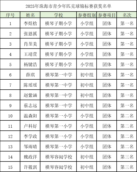 同期,2025年珠海市青少年匹克球锦标赛火热进行。横琴青少年匹克球队15名队员分别代表横琴第一中学、横琴子期小学、横琴第一小学、横琴容闳学校参赛,最终横琴子期小学获得小学组冠军,横琴第一中学获得初中组冠军,用实打实的荣誉诠释了合作区匹克球项目的普及成果与竞技水平。