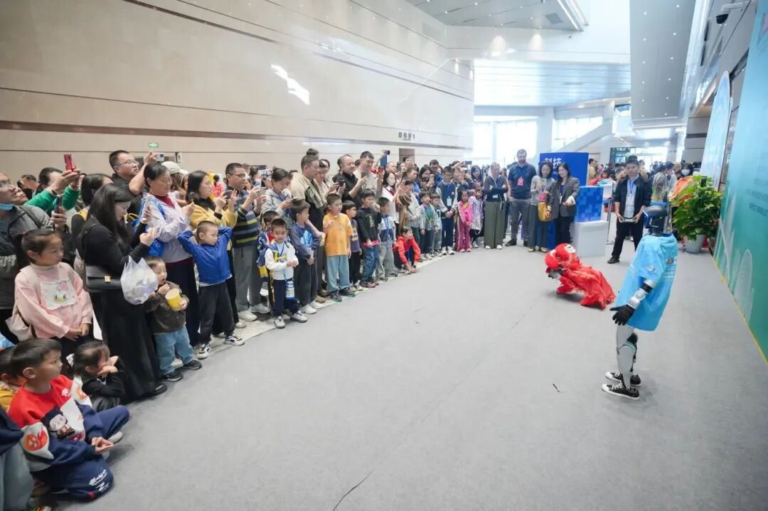 具身智能AI展区在比赛期间热度始终不减,多款人型机器人和多足机器人与观众亲密互动,完成高难度任务。