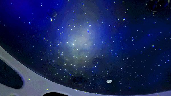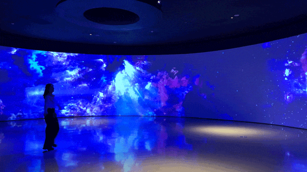隧道的尽头,一个360°环绕的穹幕空间豁然展开,无论站在哪个角度,都能无死角感受到穹幕中盘古开天辟地的震撼经过,把神话故事“玩”活了,小朋友们都看得津津有味。