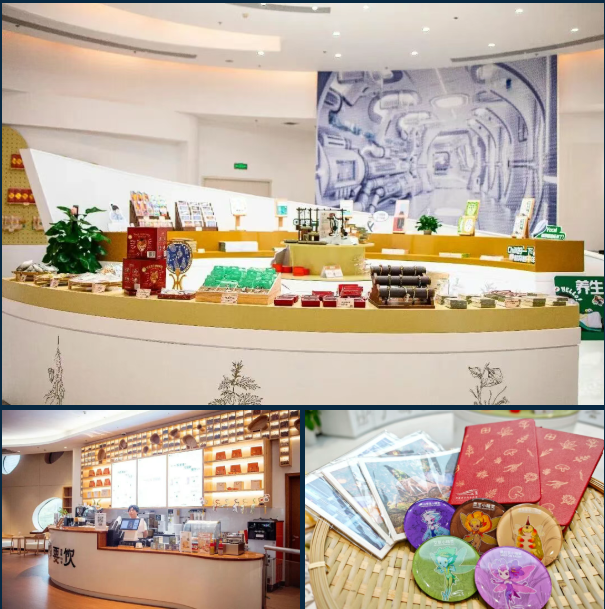 逛累了可以去养生茶饮区充充电,还可以在文创空间找到中草药小精灵IP冰箱贴、名医故事手账本和体验馆明信片等,好吃好喝一站式拿捏!