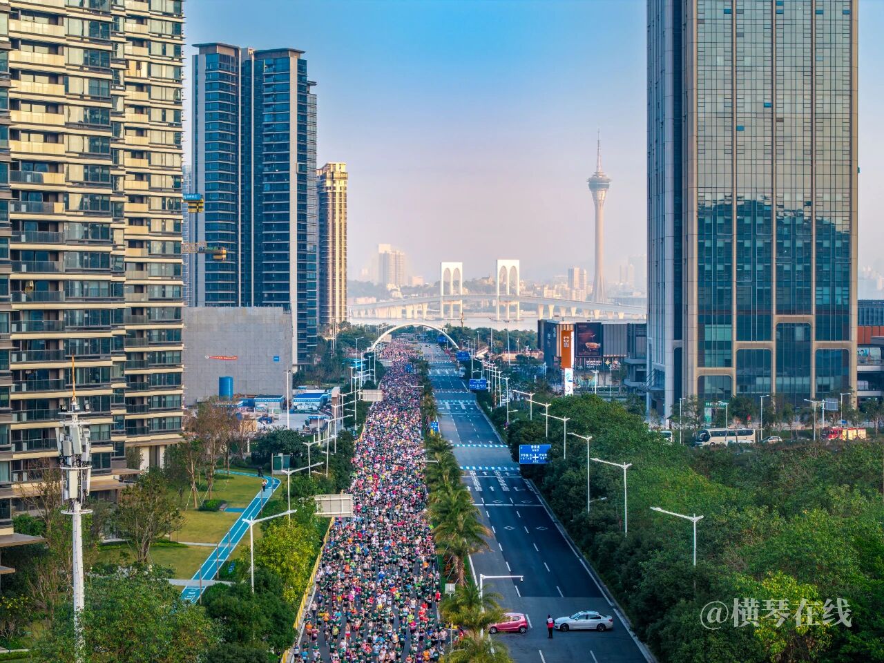 如果你在现场,你会看到这样一幕:朝阳正从对岸的澳门塔尖缓缓升起,金色的光芒同时洒在两岸的玻璃幕墙上。跑者们的脚步声与海浪拍打岸堤的声音,构成了这座海岛清晨最动听的和声。