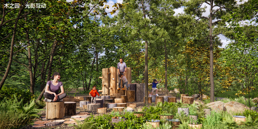 在木之园,将设攀爬木、跳跃木桩、木桩坐凳以及镜影木桩等,方便亲子休憩和游玩。