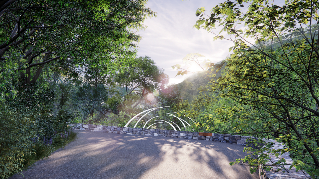 瀑之园所在区域拥有自然岩石与瀑布景观,项目将结合地形,增设游览路径,置入艺术性雕塑。