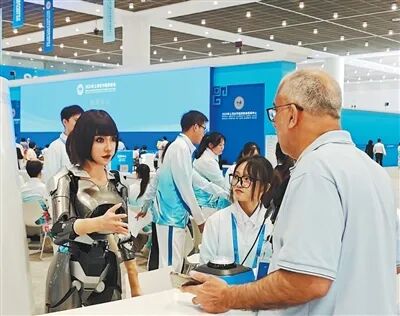 在上海合作组织天津峰会新闻中心,外国媒体记者与多模态交互型机器人“小合”对话。俄罗斯记者 爱丽克斯·玻滋达耶娃摄