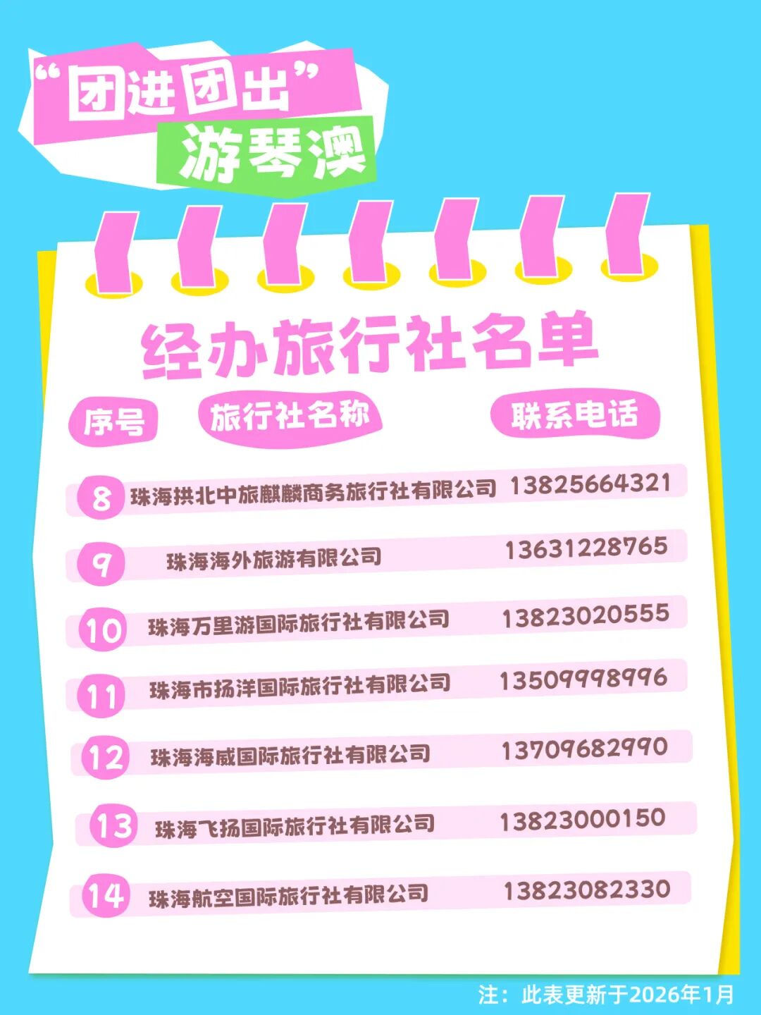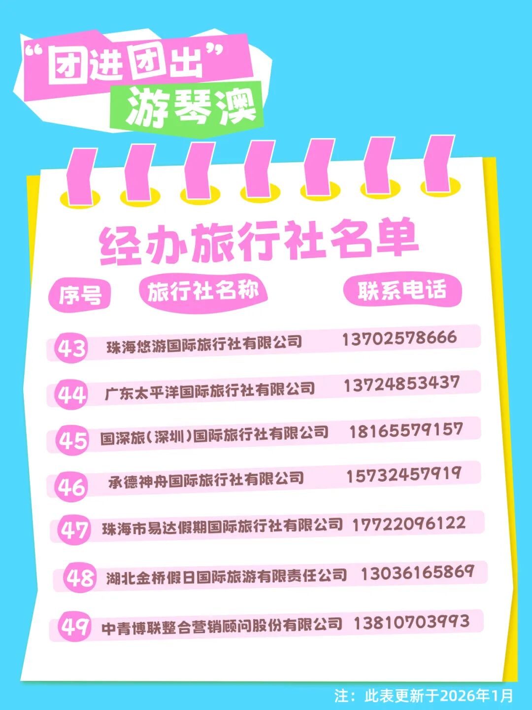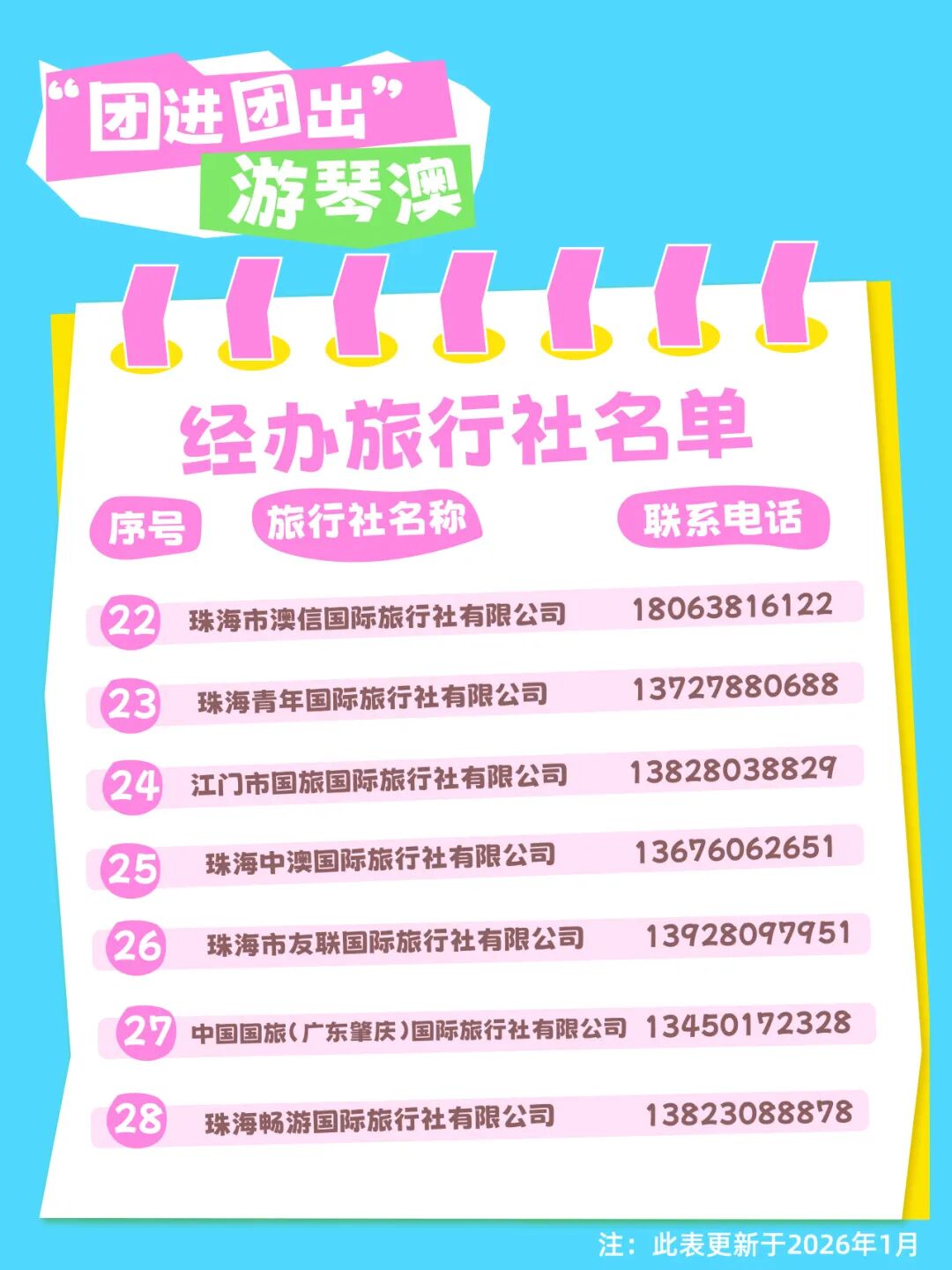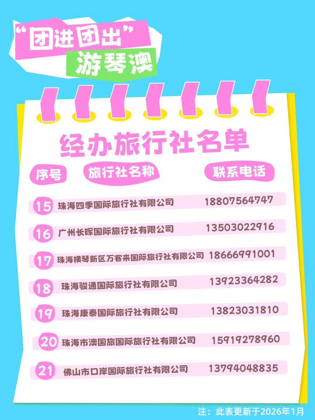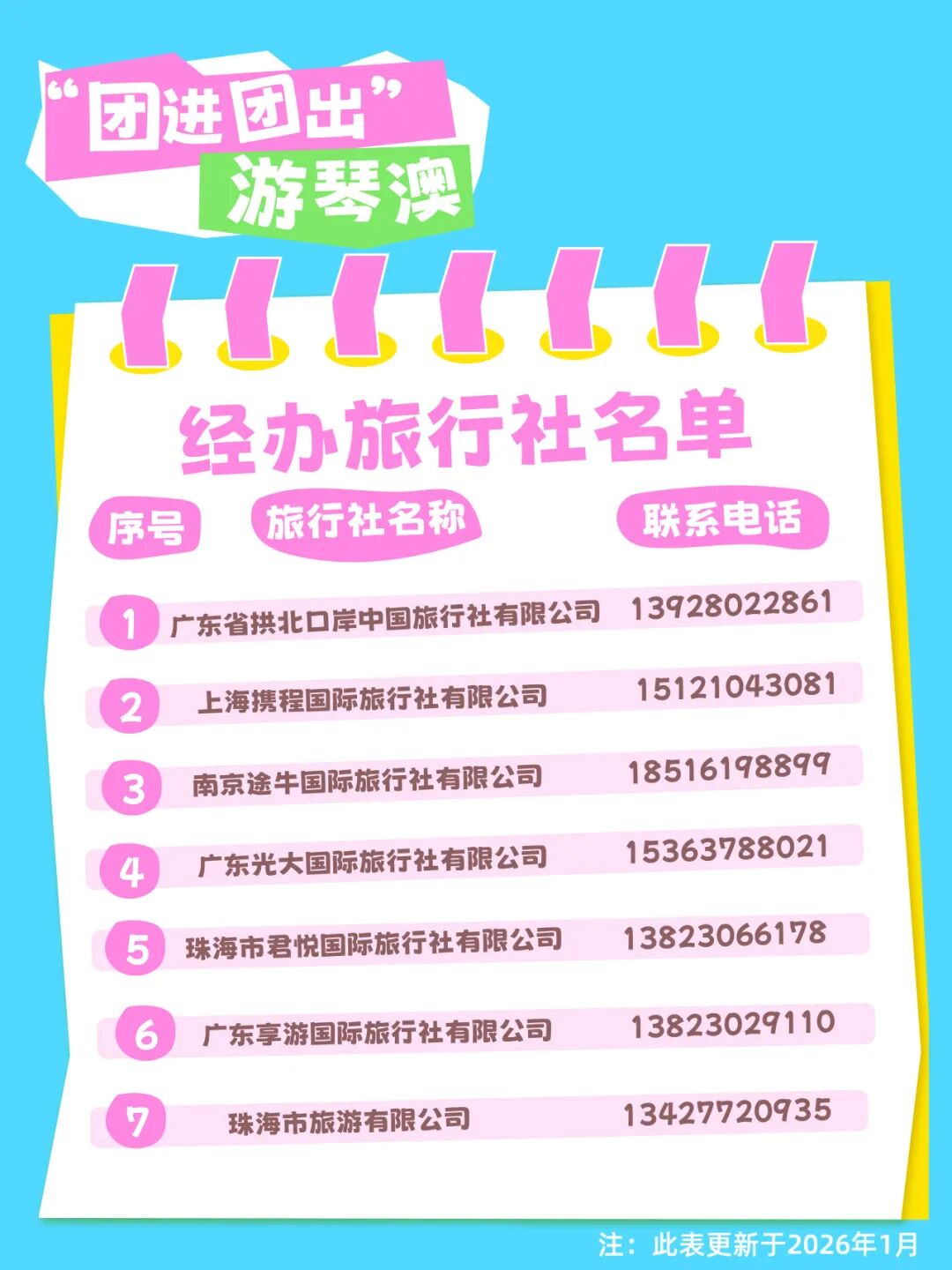 琴澳旅游团经办旅行社名单及电话如下。