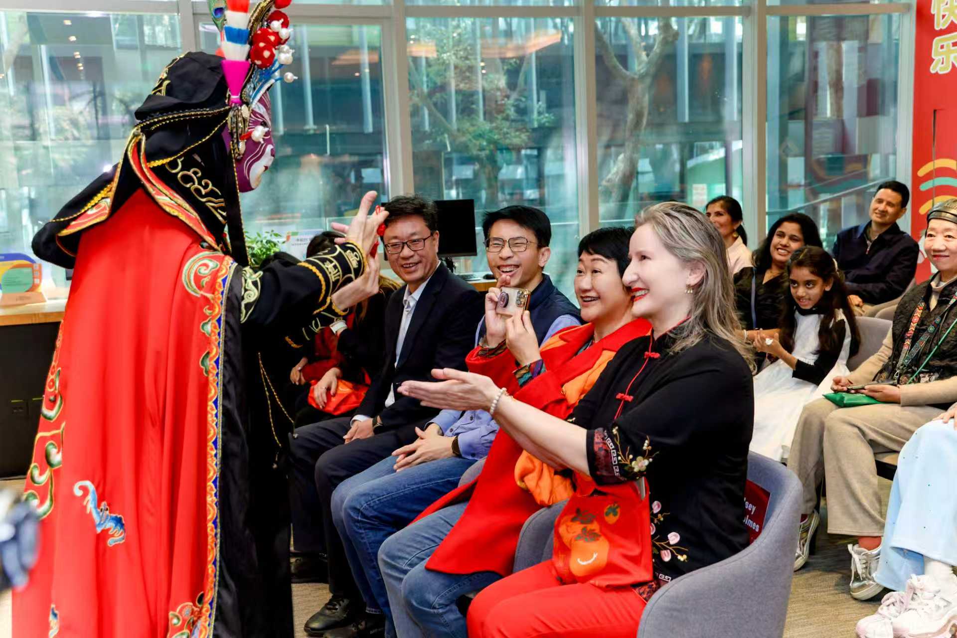 活动现场氛围喜庆祥和、暖意融融,舞狮点睛、川剧变脸等特色环节轮番上演。合作区经济发展局局长吴创伟、副局长黄中坚、广东跃昉科技有限公司首席执行官江朝晖以及哈罗礼德学校教师Lindsey Anne Holmes四位嘉宾共同为醒狮点睛,寓意赋予灵性与吉祥,精彩的群舞与高杆表演赢得阵阵掌声。随后,川剧变脸艺术家以娴熟技艺与观众互动,引来连连喝彩。