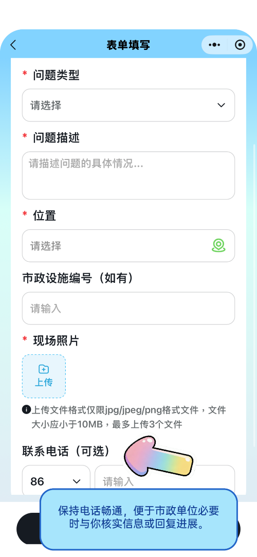 ①问题类型;②问题描述;③位置;④现场照片;⑤市政设施编号;⑥联系电话。