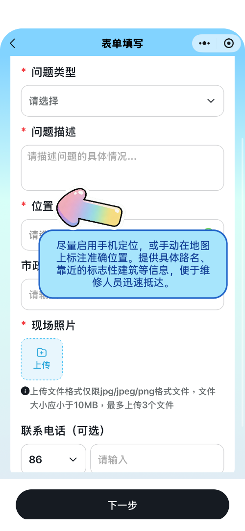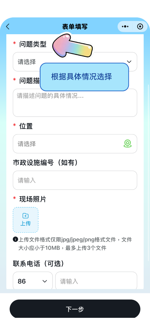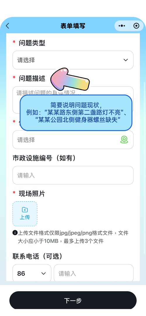 确认信息后点击“下一步”提交,市政单位将及时响应,安排核查维修。