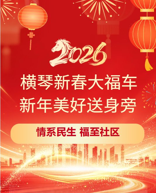 2月6日-2月8日,“情系民生,福至社区”2026横琴新春游园会将一连三日,先后在合作区四大社区和横琴“澳门新街坊”举行,满载福气的“大福车”将来到你身边,游园活动、新春礼包等您拿!