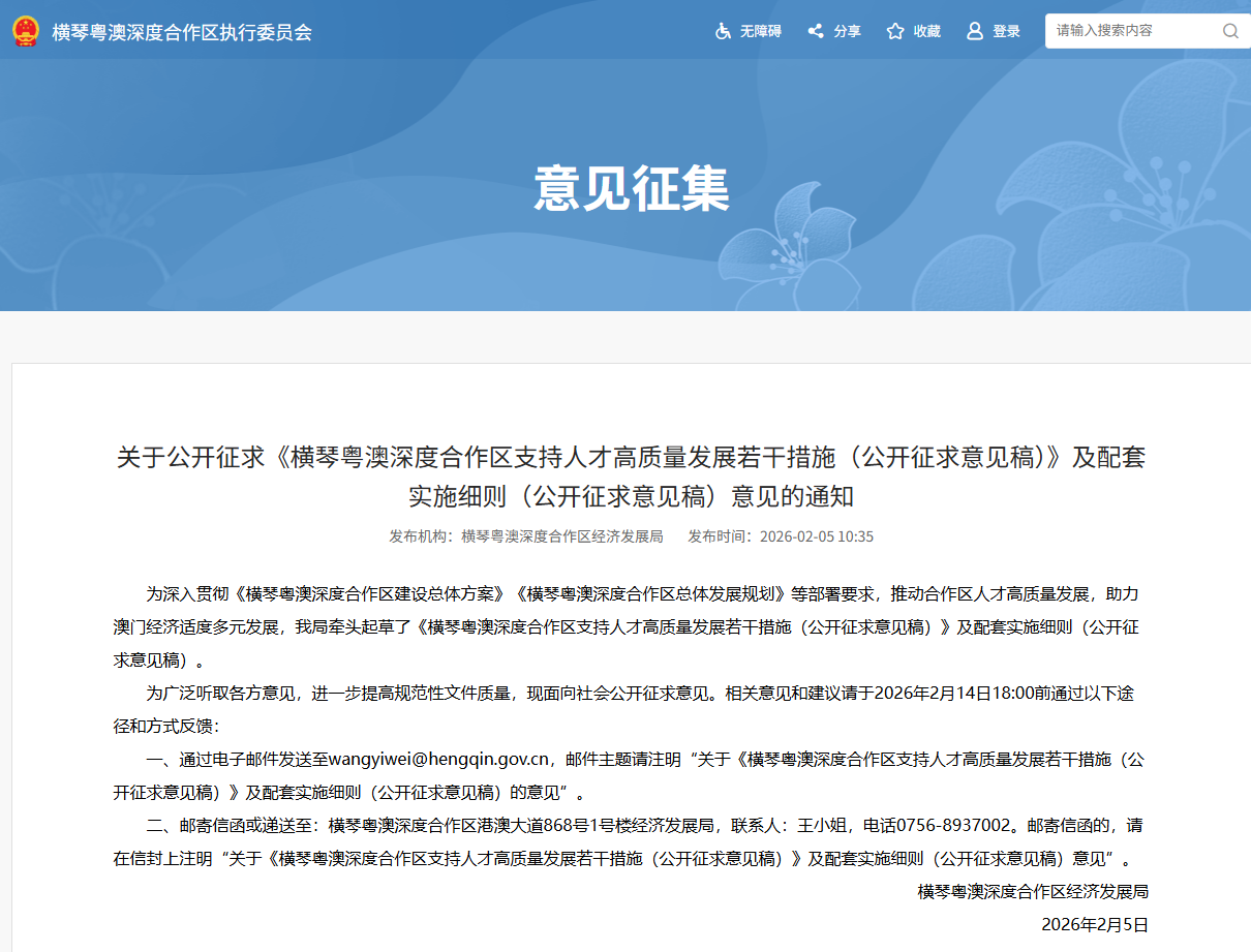 2月5日,横琴粤澳深度合作区经济发展局发布关于公开征求《横琴粤澳深度合作区支持人才高质量发展若干措施(公开征求意见稿)》及配套实施细则(公开征求意见稿)意见的通知。
