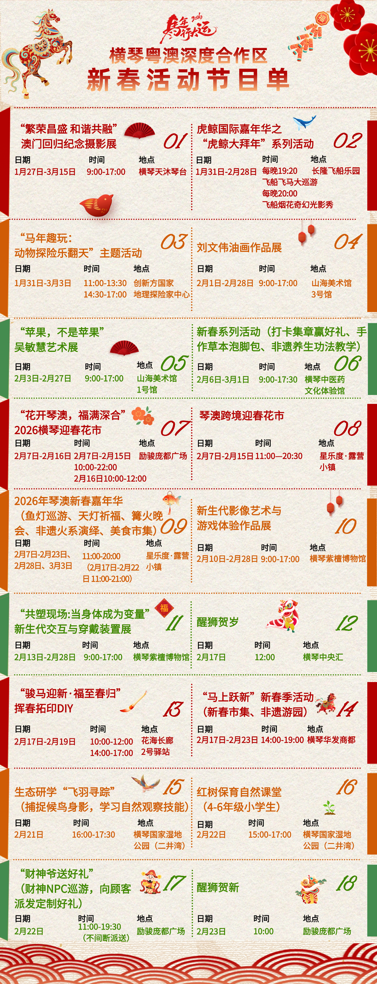 祥龙辞岁,骏马迎春。2026年春节期间,横琴粤澳深度合作区各大商圈、文旅景区推出多项迎春活动。主题乐园的“鲸”奇体验、跨境花市的烟火气息,还有非遗手作的匠心传承、文化展览的厚重雅趣……多元业态融合传统年味与现代潮玩,以热烈喜庆的节日氛围迎接广大市民游客。诚邀您在春节期间,来到横琴观赏展览、共游乐园、体验非遗,让丰富精彩的体验充满假期每一天!