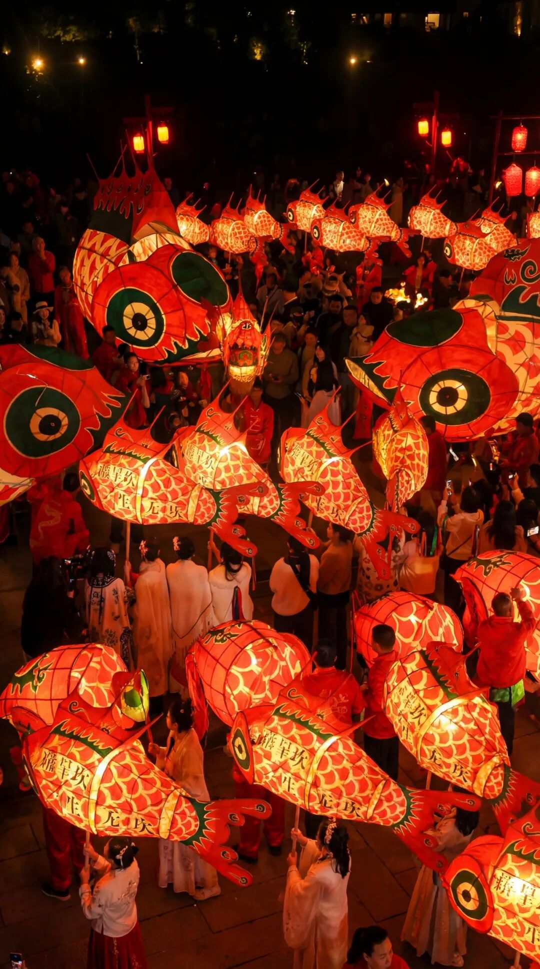 传承百年的5米巨型吉祥鱼灯领衔巡游,游客可现场体验手工制作鱼灯,并免费领取孔明灯放飞心愿。非遗火系表演更为特色,1600摄氏度的铁水化作漫天火花,国家级的非遗打铁花表演以火为笔驱邪纳吉。