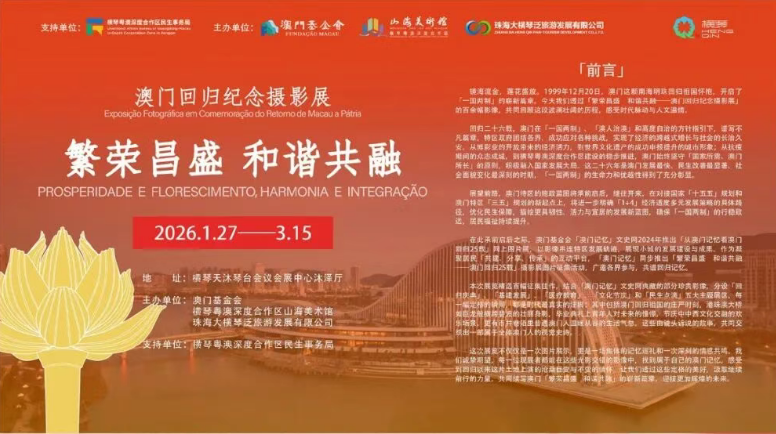 2026年1月27日至3月15日我们通过“繁荣昌盛 和谐共融——澳门回归纪念摄影展”共同回顾这段波澜壮阔的历程,感受时代脉动与人文温情。