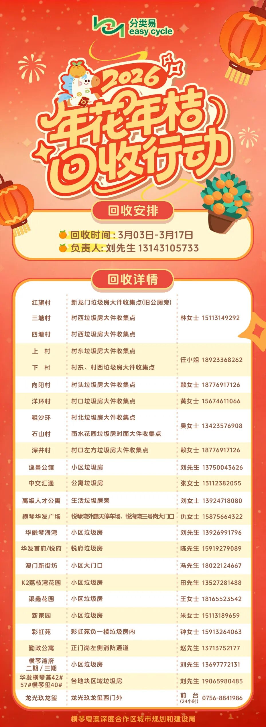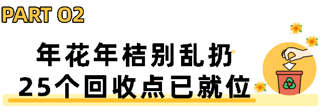 1、春节假期结束后,请市民自行将年花年桔投放至小区或各村(社区)指定的回收点,由小区物业等单位联系清运单位进行集中处理。