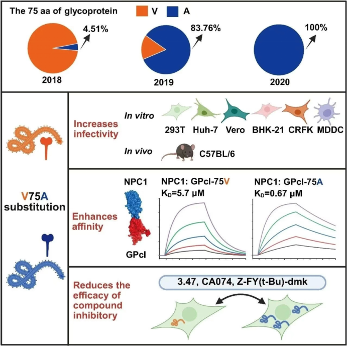 为验证GP-V75A突变的生物学效应,团队利用多种细胞感染模型以及动物感染模型开展研究,结果表明该突变能显著增强EBOV对多种宿主细胞及小鼠的感染能力。