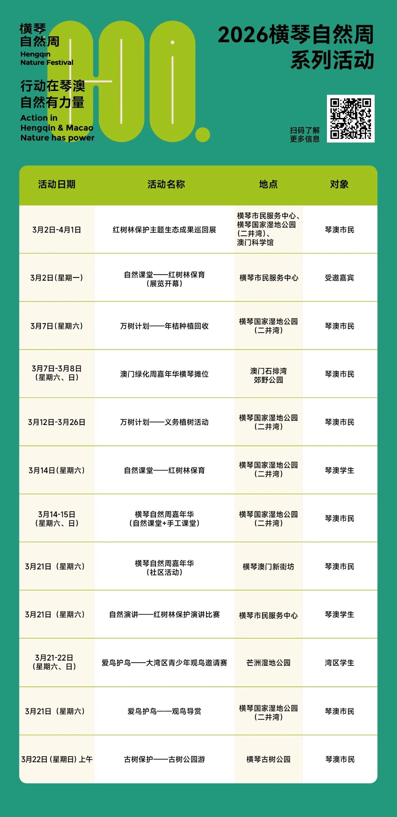 这个三月,让我们暂别喧嚣,走进红树林的奇妙世界,每一场活动都是一次与自然的深度对话,每一次参与都是对生态未来的温柔承诺。横琴自然周,期待与你相遇——在红树林的绿荫下,在候鸟的羽翼间,在每一次俯身种植、抬头观察的瞬间,共赴一场春日里的绿色约定。