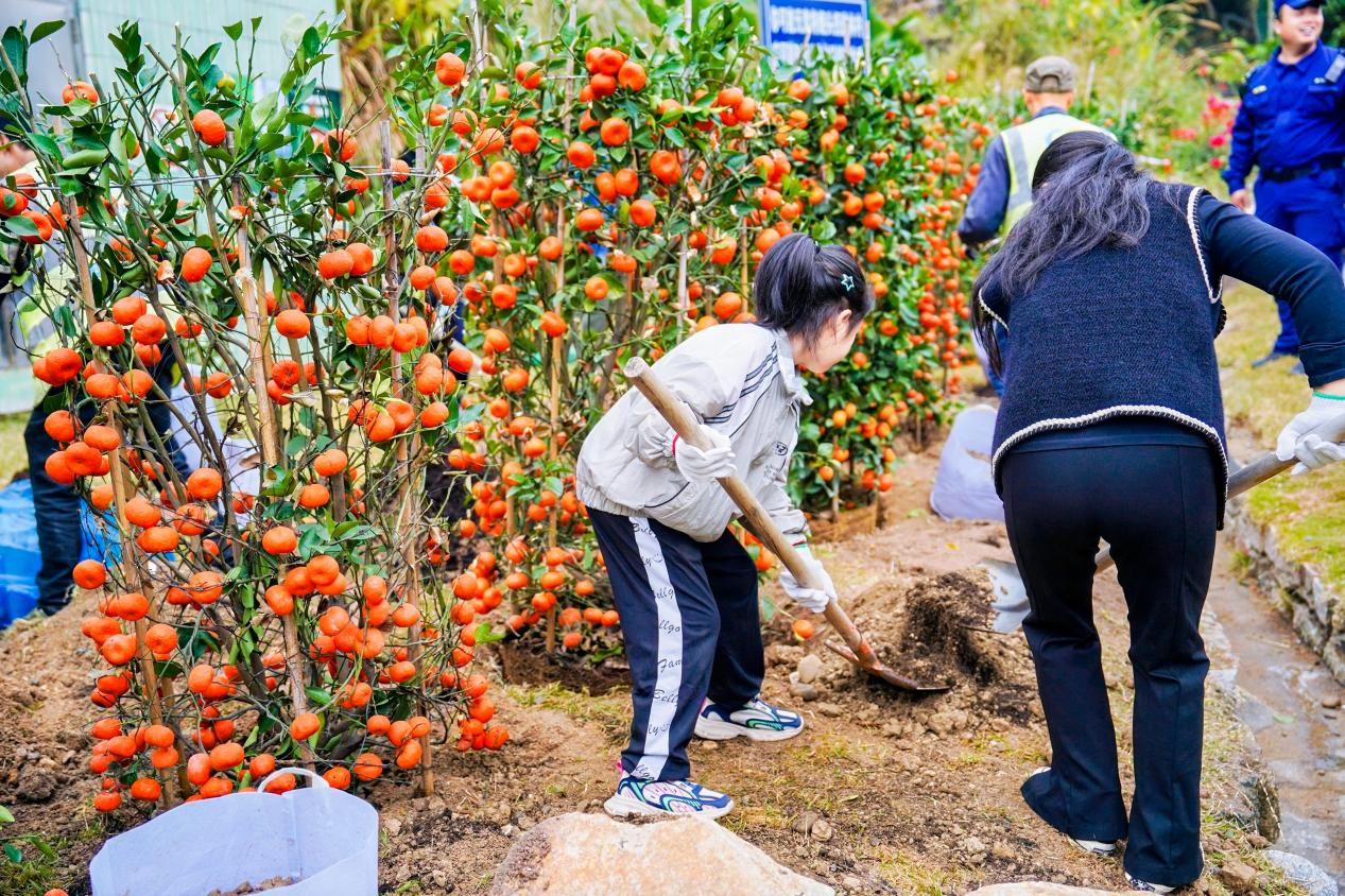 年桔种植回收活动聚焦春节后回收的年桔循环再利用,旨在探索解决因年宵花卉绿植“节后即弃”而衍生的环保问题,为承载着新春“大吉”寓意的年桔赋予“第二次生命”。琴澳居民亲手将春节期间回收的年桔移栽入园,以别开生面的环保实践方式,共同为这个春日植下一片盎然绿意。