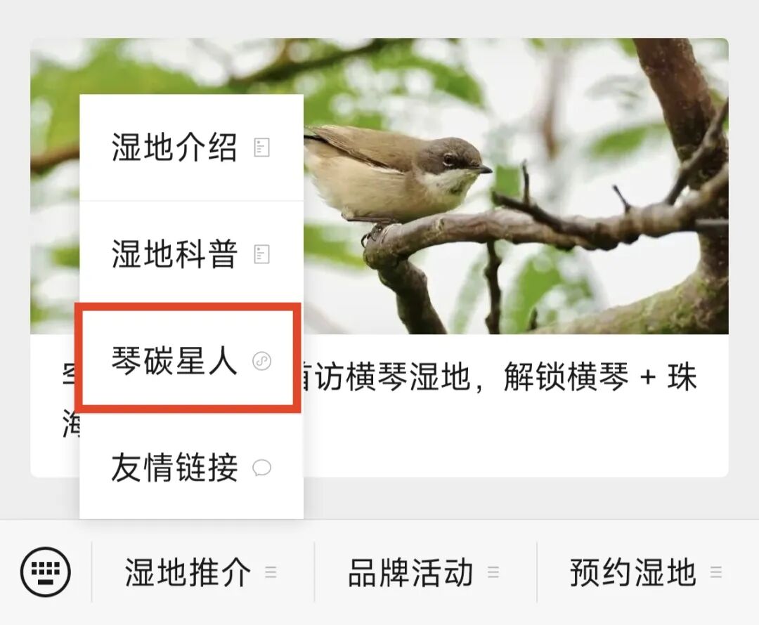 ➤第一步:点击“横琴湿地”公众号菜单栏中的「湿地推介」—「琴碳星人」。