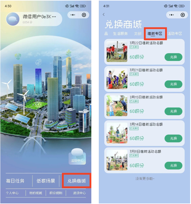 ➤第二步:进入【首页】-【兑换商城】-【植树专区】,仅需60碳积分,即可解锁属于你的小树苗!