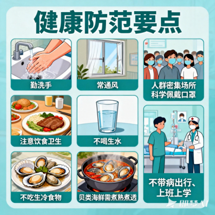 ✦注意饮食卫生,不喝生水、不吃生冷食物,贝类海鲜需煮熟煮透;