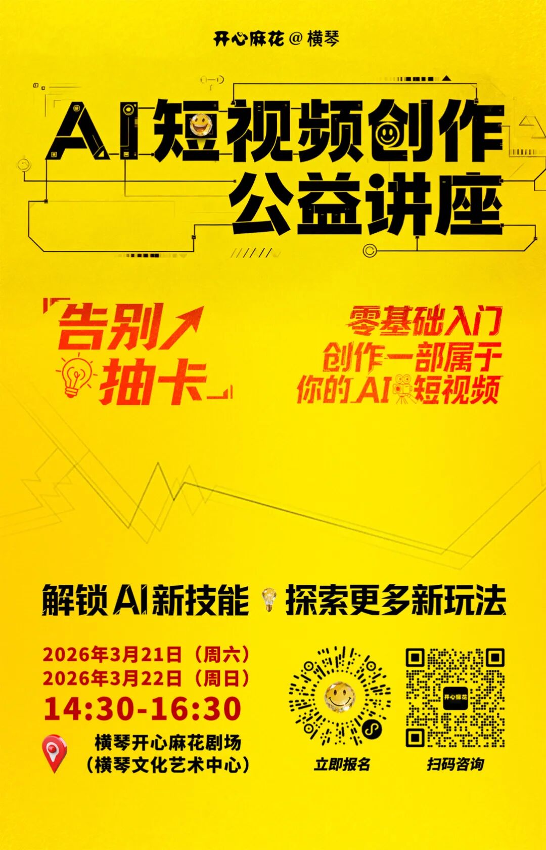 AI改变生活,也彻底改变了创作门槛。只需要一位创作者,加上AI工具,就能独立完成一场属于自己的作品。横琴开心麻花公益讲座——AI短视频创作,带你打破AI视频创作壁垒,欢迎来参加。