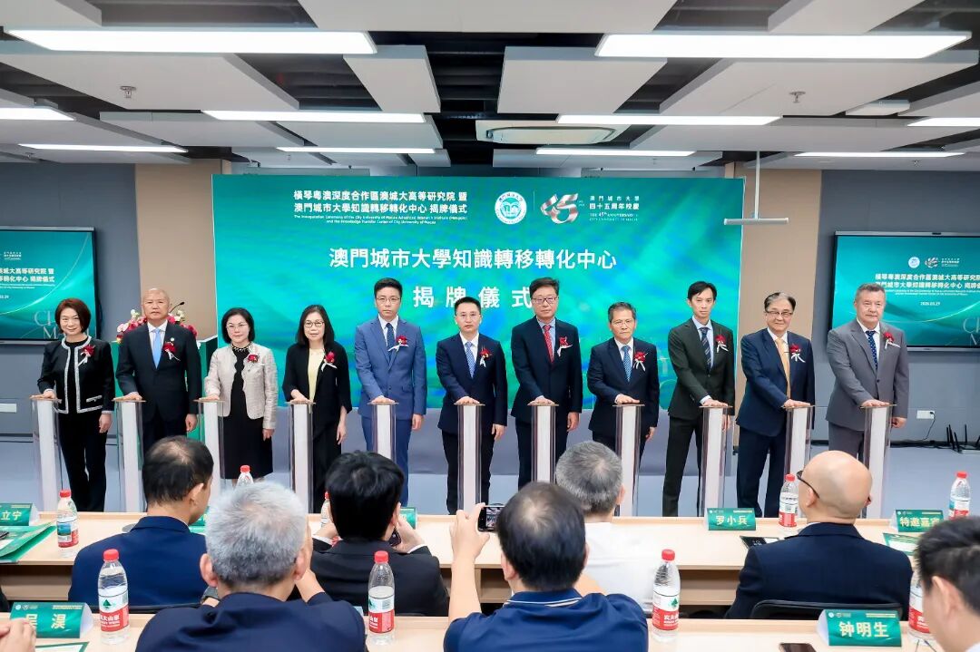 在主礼嘉宾的见证下,横琴澳城大高等研究院暨澳门城市大学知识转移转化中心正式揭牌。