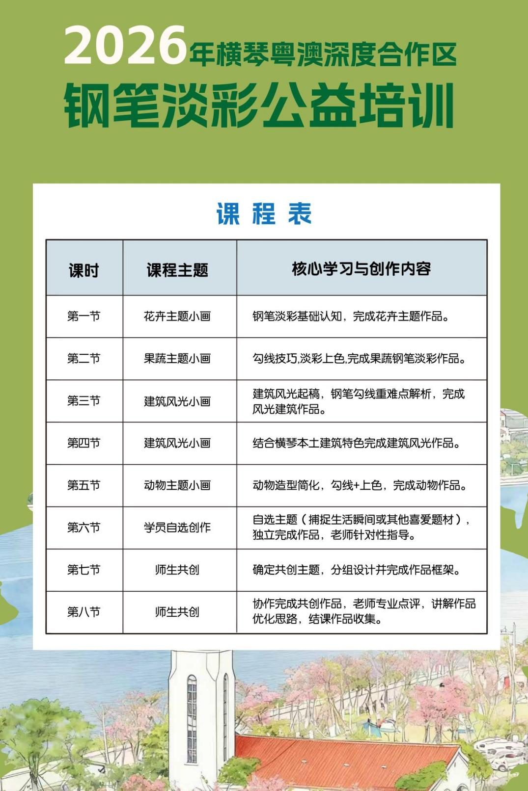 为持续提供高质量公共文化服务,由合作区民生事务局主办的2026年横琴粤澳深度合作区钢笔淡彩公益培训即日起开始报名。