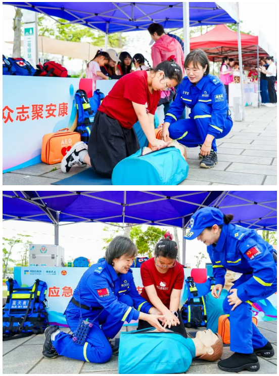 抵达终点后,现场设置“义爱传城暖”“应急护民安”“绿电润莲城”等互动体验区,吸引众多参与者驻足体验。参与者在交流互动中传递“我志愿,我快乐”的志愿精神,与国电投(珠海横琴)热电志愿服务队志愿者一同探索绿色能源的奥秘;在蓝天救援志愿服务队教官的专业指导下,实操学习心肺复苏、海姆立克急救法等实用应急技能,现场气氛热烈。