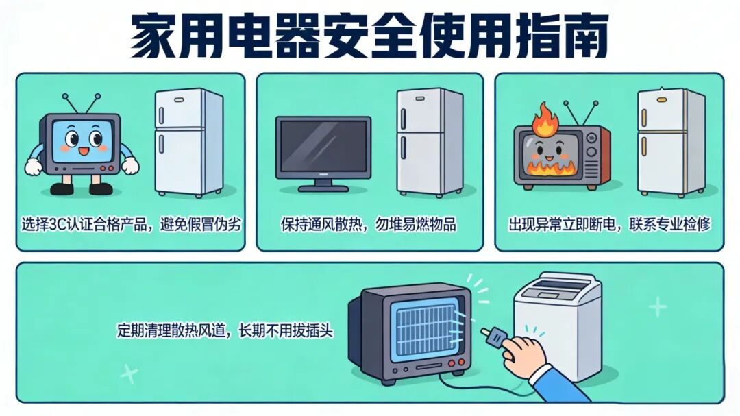 一、规范家用电器使用,杜绝设备隐患。电视机、冰箱等常用家电,应选择3C认证合格产品,避免使用假冒伪劣产品。使用时要保持通风散热,避免电器周围堆放窗帘、衣物等易燃物品,防止热量积聚引发火灾。家电出现异常发热、异响、焦味等情况,应立即切断电源,停止使用并联系专业人员检修,切勿自行拆解维修。冰箱需定期清理散热风道,电视机长时间不用时应拔掉电源插头,避免待机状态下的安全隐患。