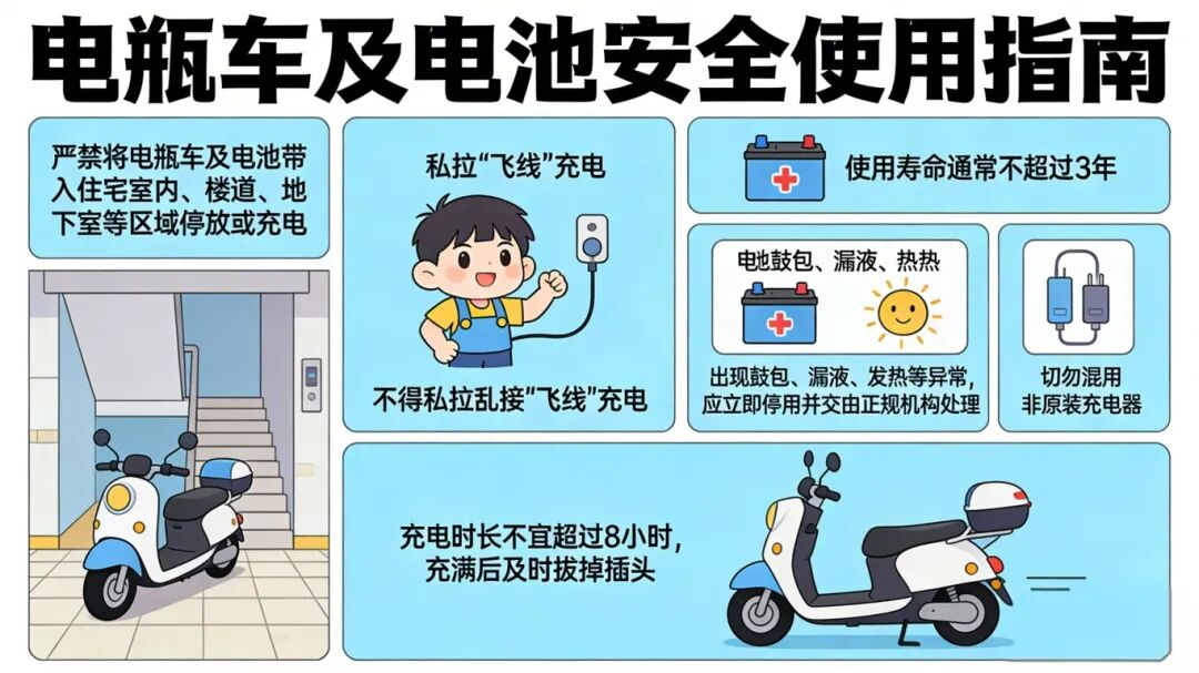 二、严控电瓶车及电池使用,守住安全底线。严禁将电瓶车及电池带入住宅室内、楼道、地下室等区域停放或充电,不得私拉乱接“飞线”充电。电瓶车电池使用寿命通常不超过3年,若出现鼓包、漏液、发热等异常,应立即停用并交由正规机构处理,切勿混用非原装充电器,充电时长不宜超过8小时,充满后及时拔掉插头。