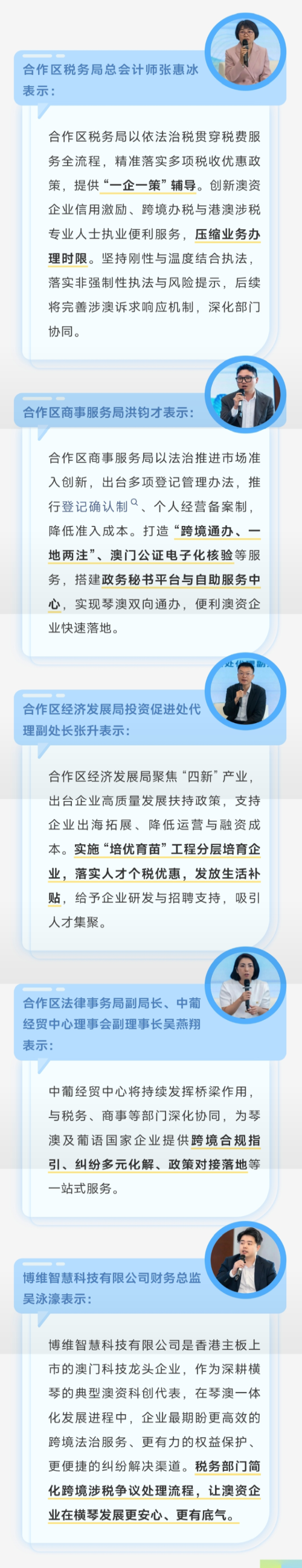 合作区税务局有关负责人表示,将继续以法治为引领、以公平为导向、以服务为抓手,持续深化税费政策精准落地、办税服务提质增效、跨境办税便利创新。联动各部门搭建更高效的政企沟通平台,不断优化市场化、法治化、国际化税收营商环境,为琴澳一体化高质量发展注入更强、更稳、更可持续的税务动能。