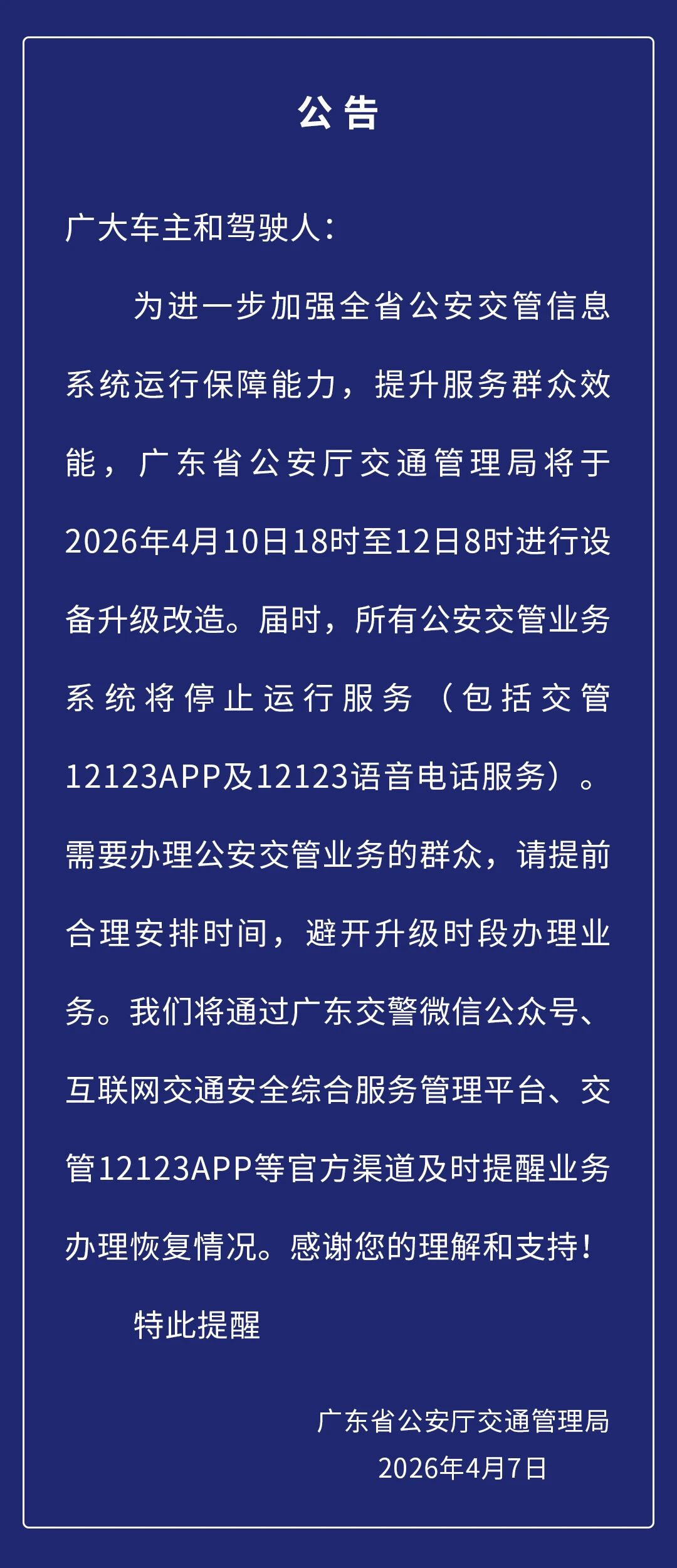 据悉,为进一步加强全省公安交管信息系统运行保障能力,提升服务群众效能,广东省公安厅交通管理局将于2026年4月10日18时至12日8时进行设备升级改造。