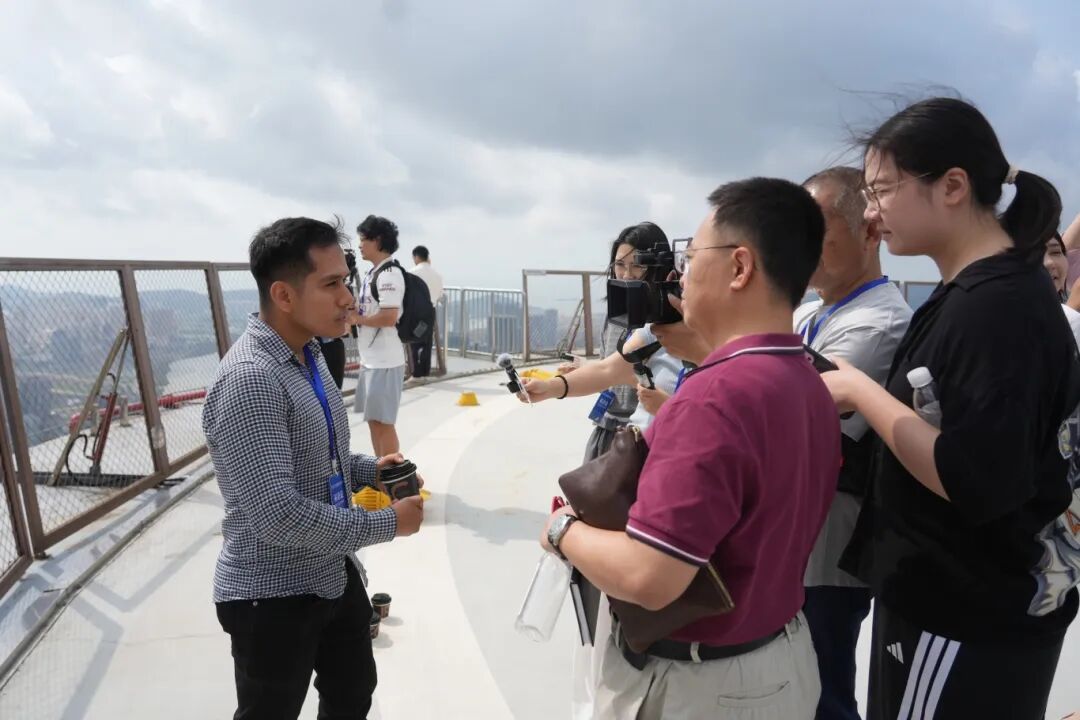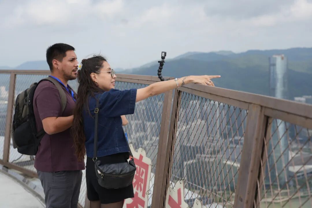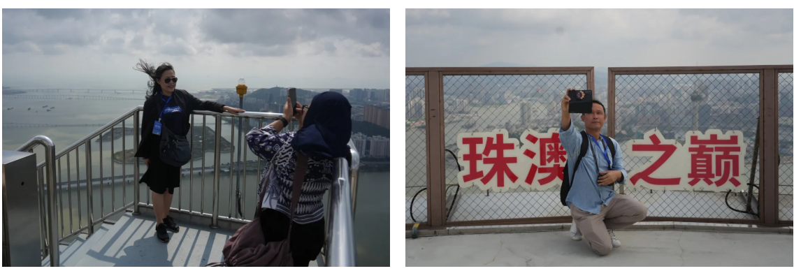 媒体团的首站,便来到了琴澳之巅——横琴国际金融中心(IFC)。这座339米的摩天大楼是横琴、澳门、珠海三地的最高地标,登上顶层停机坪,视野豁然开朗,琴澳两地尽收眼底,媒体团成员都纷纷举起手机,定格这一瞬间。