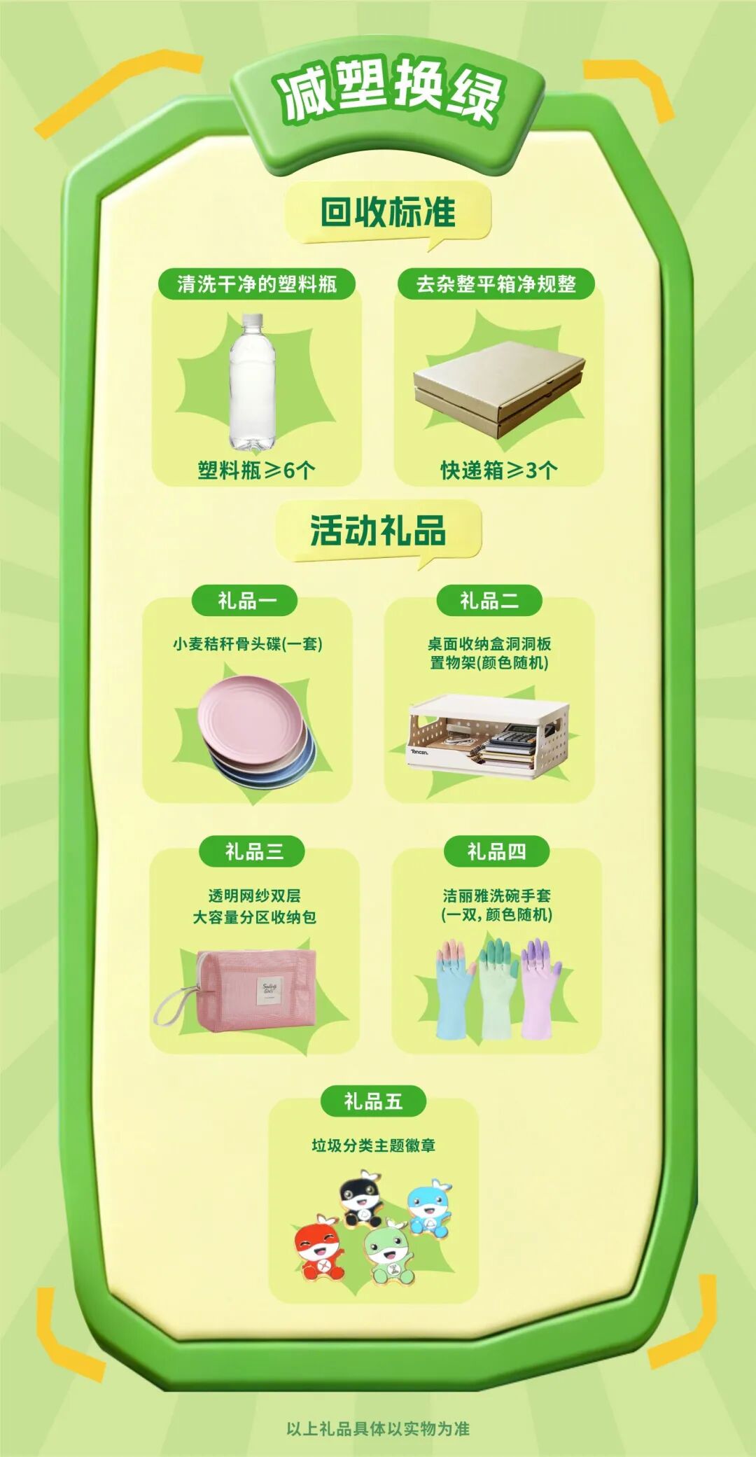 3.互动抽奖:前往您所在社区的指定摊位,了解“科普内容,学习减塑知识;现场凭物资及关注记录兑换抽奖券,赢取环保纪念品。