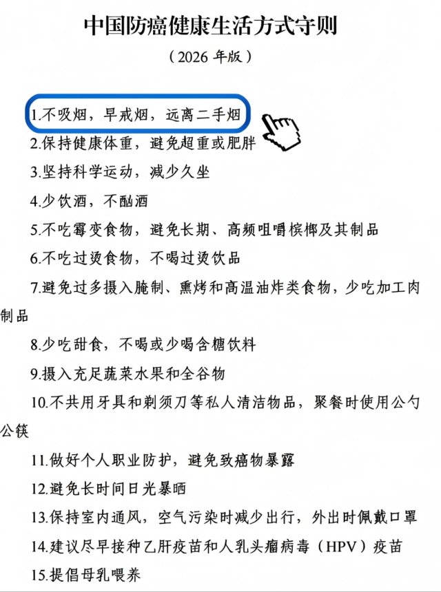 近日,国家卫生健康委正式发布《中国防癌健康生活方式守则(2026版)》,它不是晦涩难懂的医学论文,也不是夸大其词的养生噱头,而是一本人人能看懂、照着做就能降低患癌风险的“官方防癌说明书”。