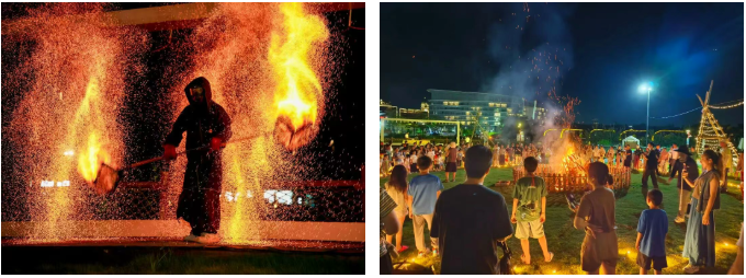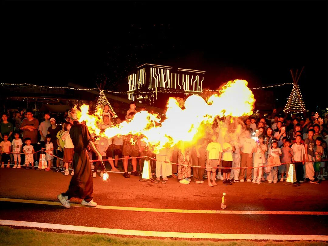 入夜后,一场非遗浪漫夜宴开场——800架无人机腾空而起上演光影大秀,非遗打铁花更是以1600℃的铁水在湖面绽放如流星雨般绚烂,配合5米大鱼灯领航的鱼灯巡游、天灯祈福与篝火晚会,将假期的“情绪价值”拉至满格。