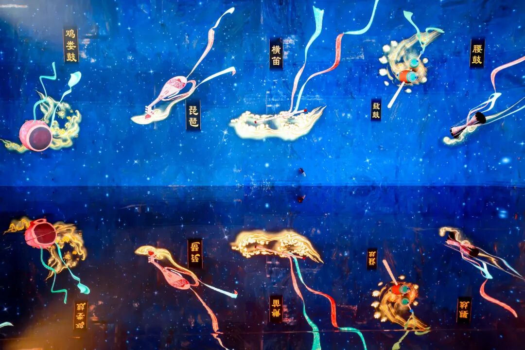 在这里,数字技术不仅跨越了时间与空间的阻隔,更搭建起一座可感、可触、可交互,连接过去与未来的桥梁。“舞乐敦煌”数字沉浸展呈现莫高窟特窟初唐321窟北壁的西方净土经变画,用光影数字艺术来重新活化古代的壁画,展现穿越千年、恢宏大气的敦煌天乐境界之美。