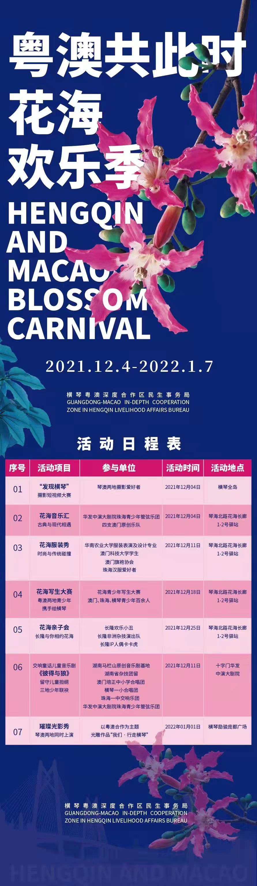 12月的横琴粤澳深度合作区,樱花木棉次第绽放,在灿若云霞的樱花木棉花期里,横琴粤澳深度合作区将以花海长廊为载体,举办“发现横琴”摄影短视频大赛、花海音乐汇、服装秀、花海亲子会、儿童音乐剧、璀璨光影秀等一系列活动。